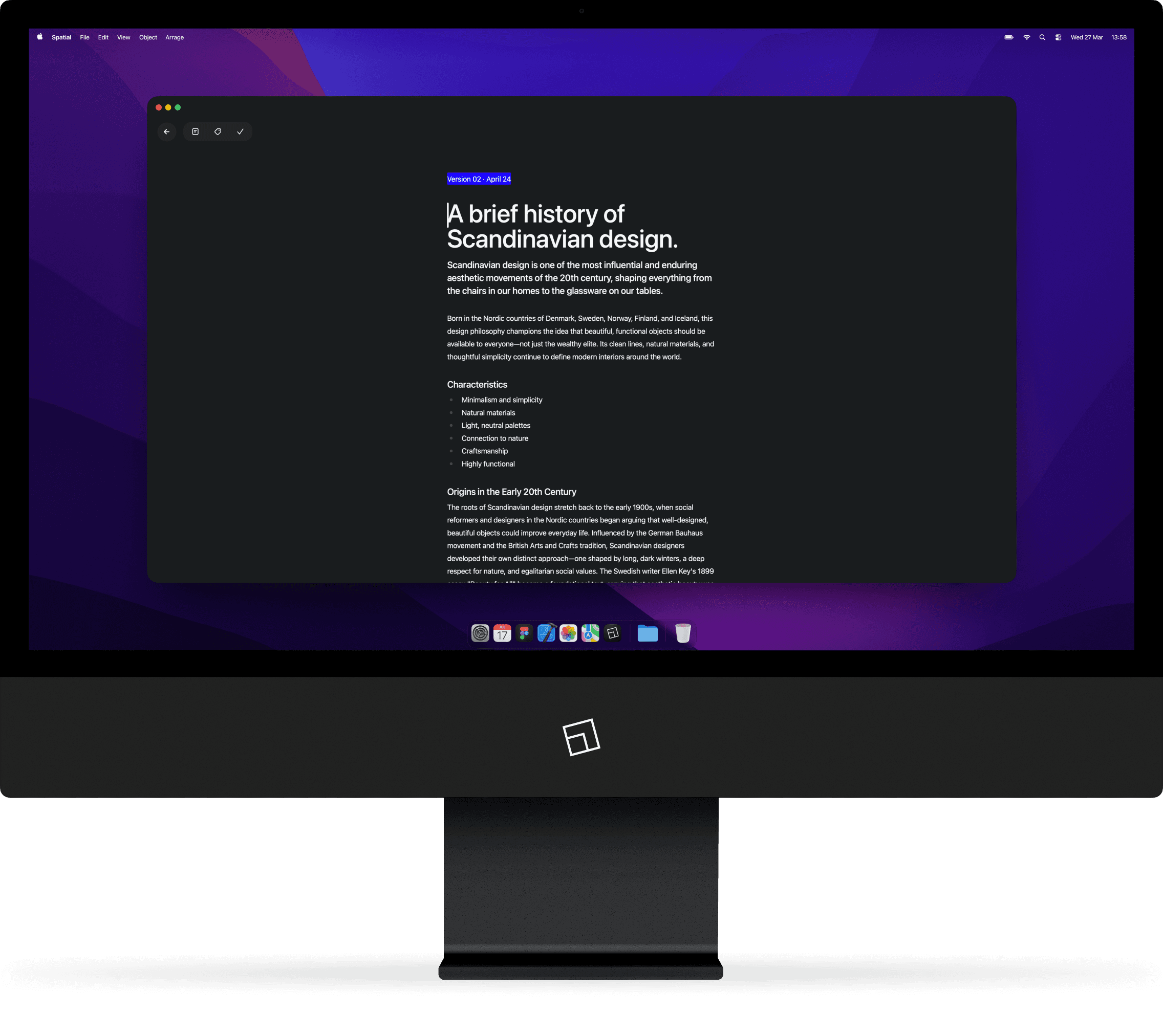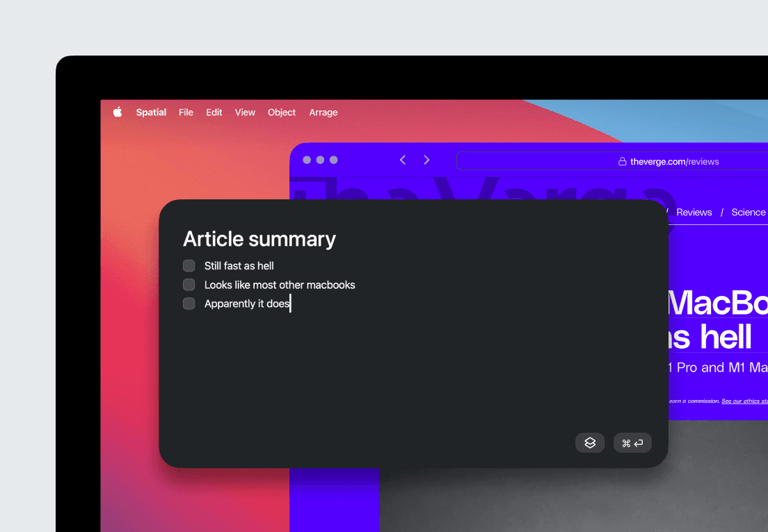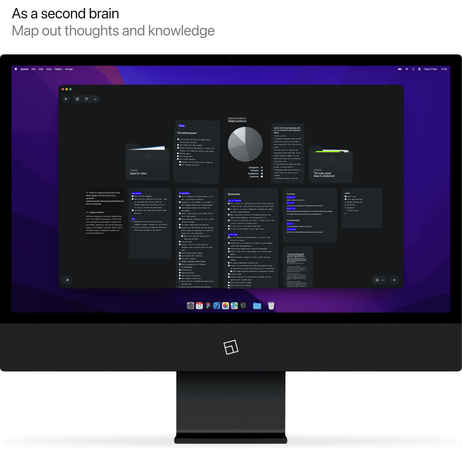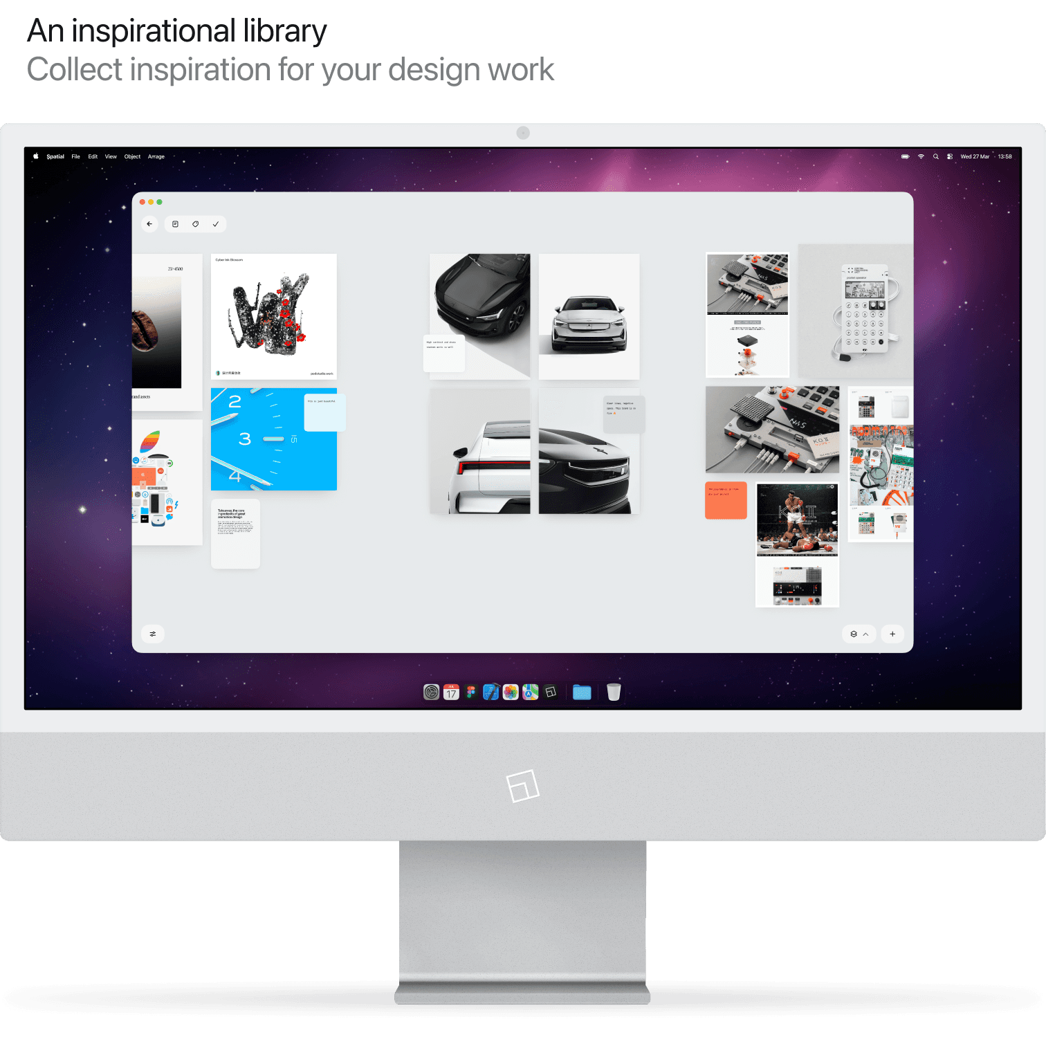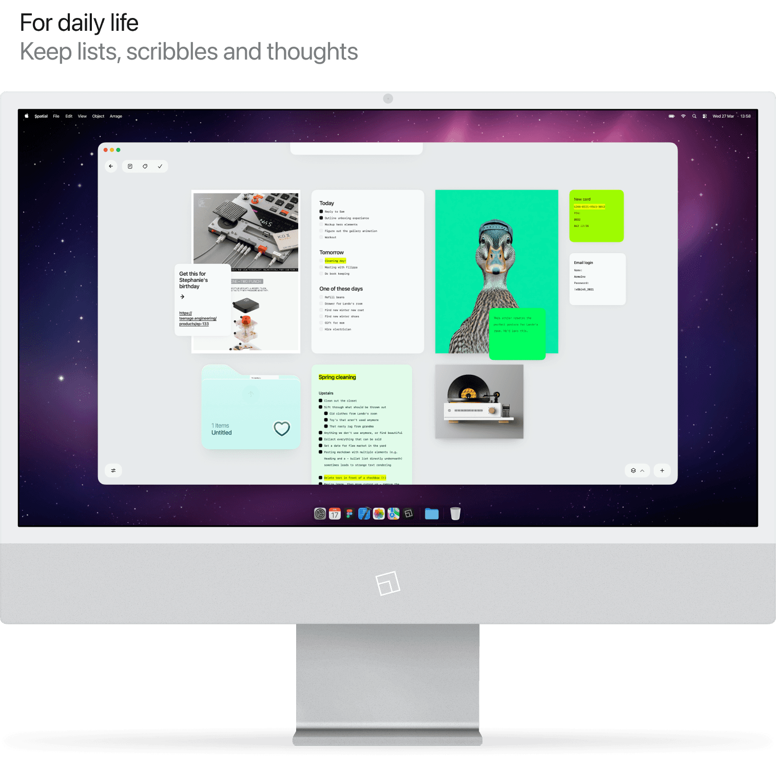 Spatial is designed for three core purposes. (1) For collecting visual inspiration like graphics, animation and web clips. (2) As a second brain with notes and stickies. And (3) for managing daily life with lists, capturing thoughts and planning ahead.